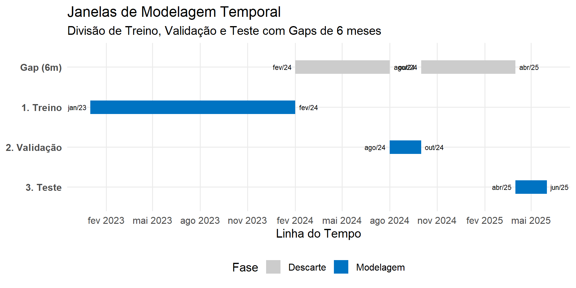- Para evitar vazamento de informação (target leakage) em modelos comportamentais, a separação dos dados precisa respeitar a lógica temporal do rótulo: cada observação (cliente, mês) usa informações dos próximos 6 meses para definir a variável-alvo (
