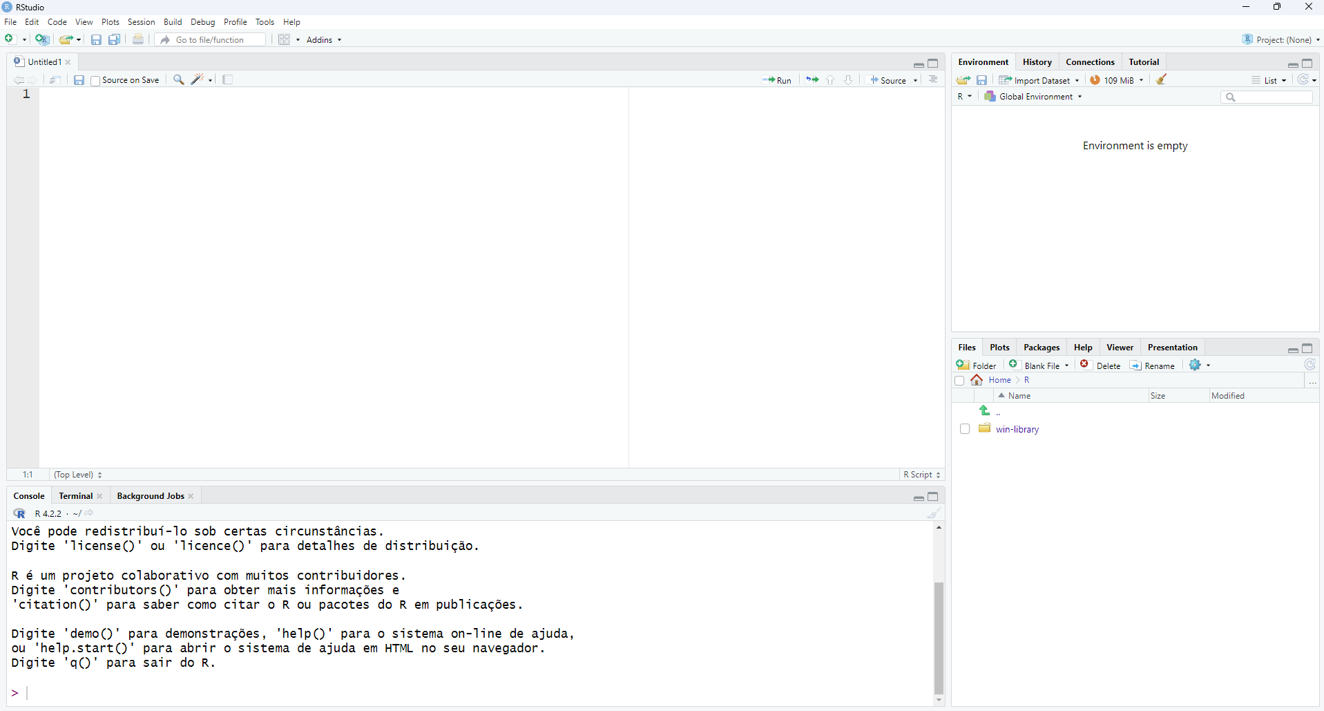 Ao abrir o RStudio, clique no menu File/ New File/ R Script (ou Ctrl+Shift+N). Você deve ver uma estrutura como a mostrada na figura abaixo.