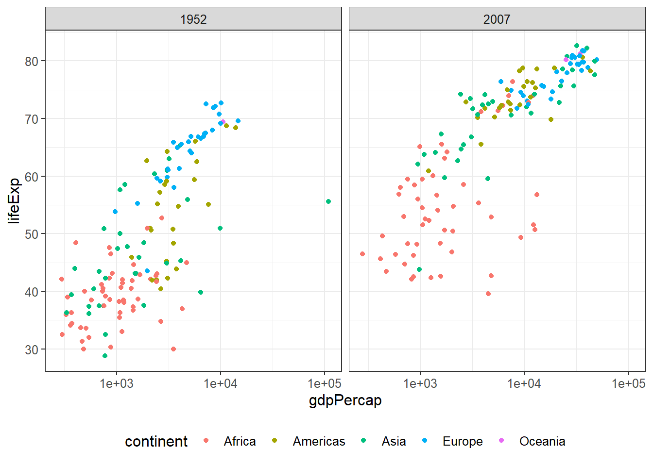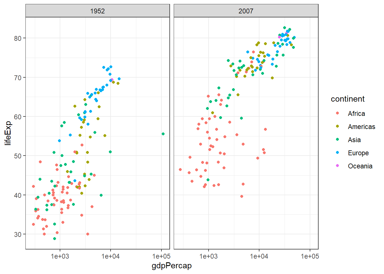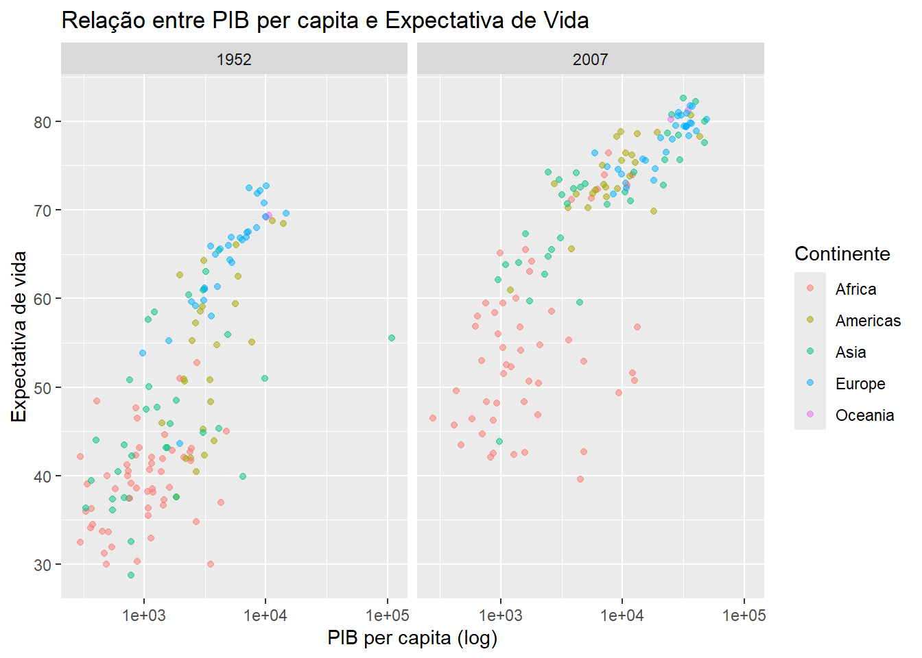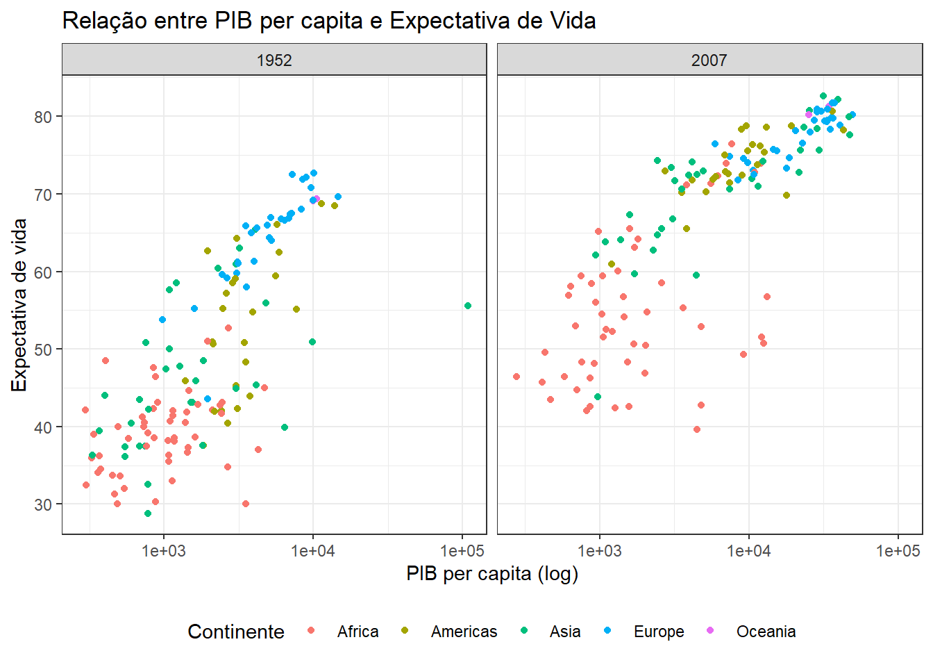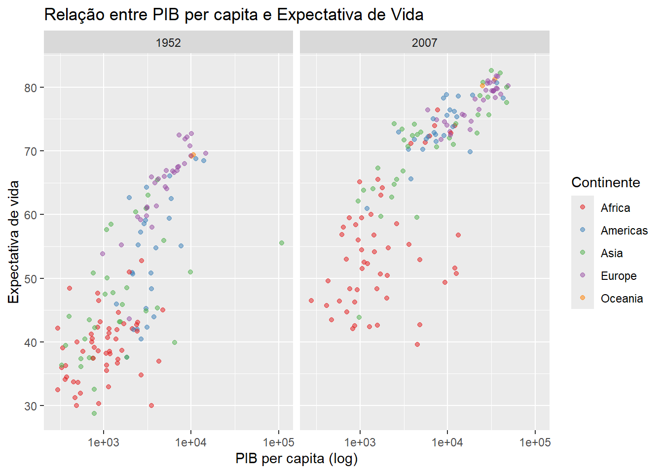 Por exemplo, podemos usar facetas para criar um gráfico de dispersão separado para dois anos distintos, permitindo comparar as relações entre o PIB per capta e a expectativa de vida nesses dois anos.