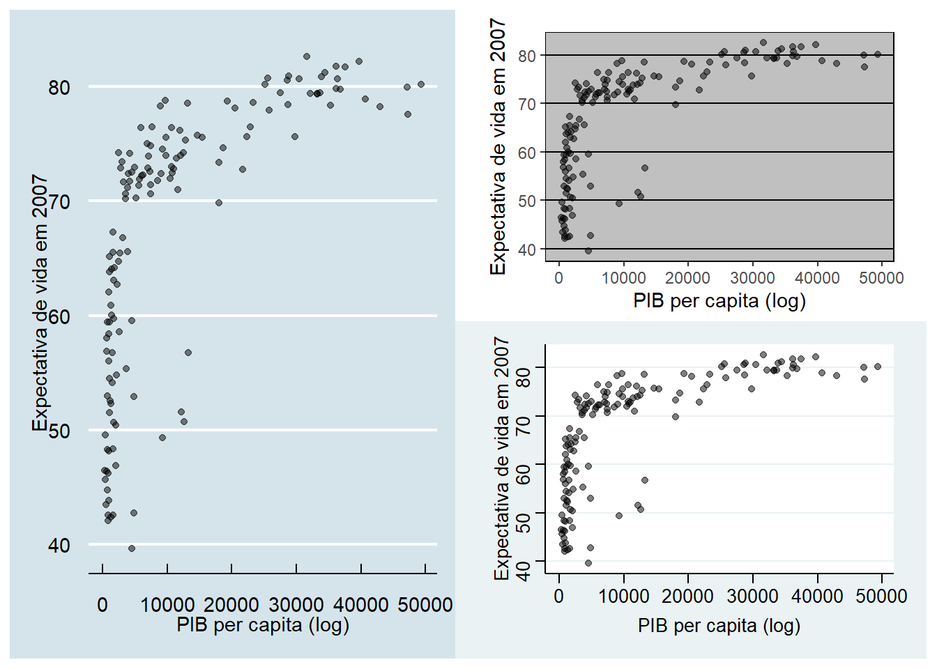 É possível aplicar a escala logarítmica aos eixos também. Isso é útil quando os dados têm uma ampla variação de valores e estamos interessados em destacar diferenças em uma ampla gama de valores, como em dados de renda ou PIB. Para fazer isso, basta utilizar a função scale_*_log10():