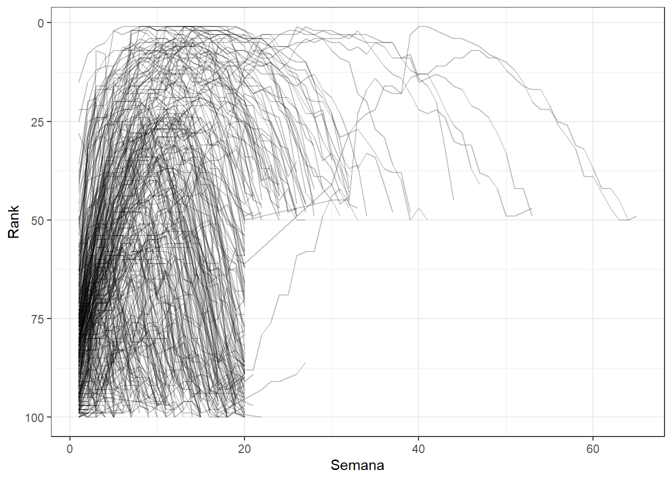 a) O gráfico abaixo mostra o histórico de cada musica no ranking ao longo das semanas.