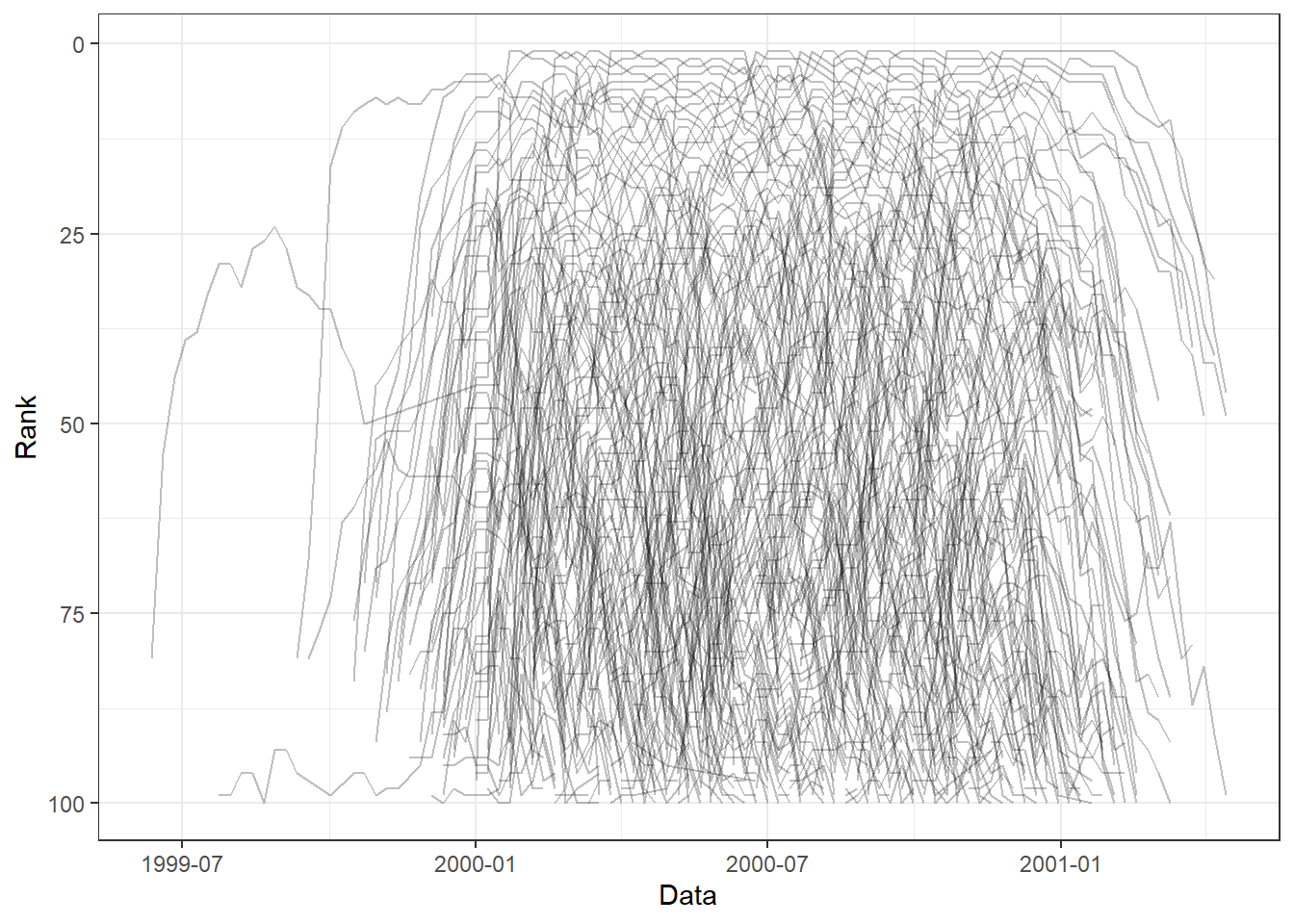 1. Vamos utilizar os dados da Billboard que foram apresentados na Seção 3.7. Sua tarefa é reproduzir os gráficos abaixo utilizando técnicas de processamento de dados com dplyr e visualização de dados com ggplot.