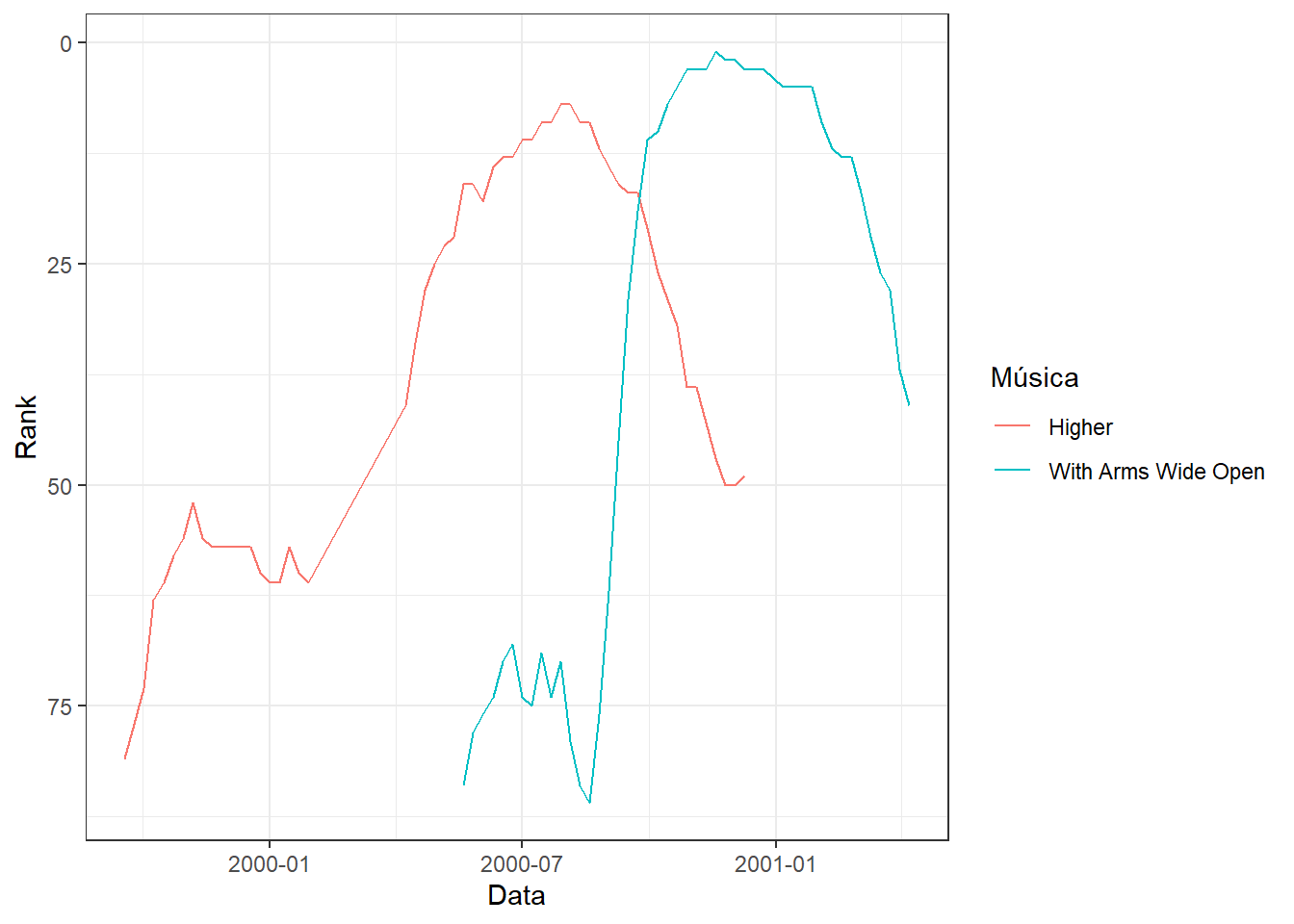 c) O gráfico abaixo mostra o histórico de duas músicas no ranking: “Higher” e “With Arms Wide Open”.