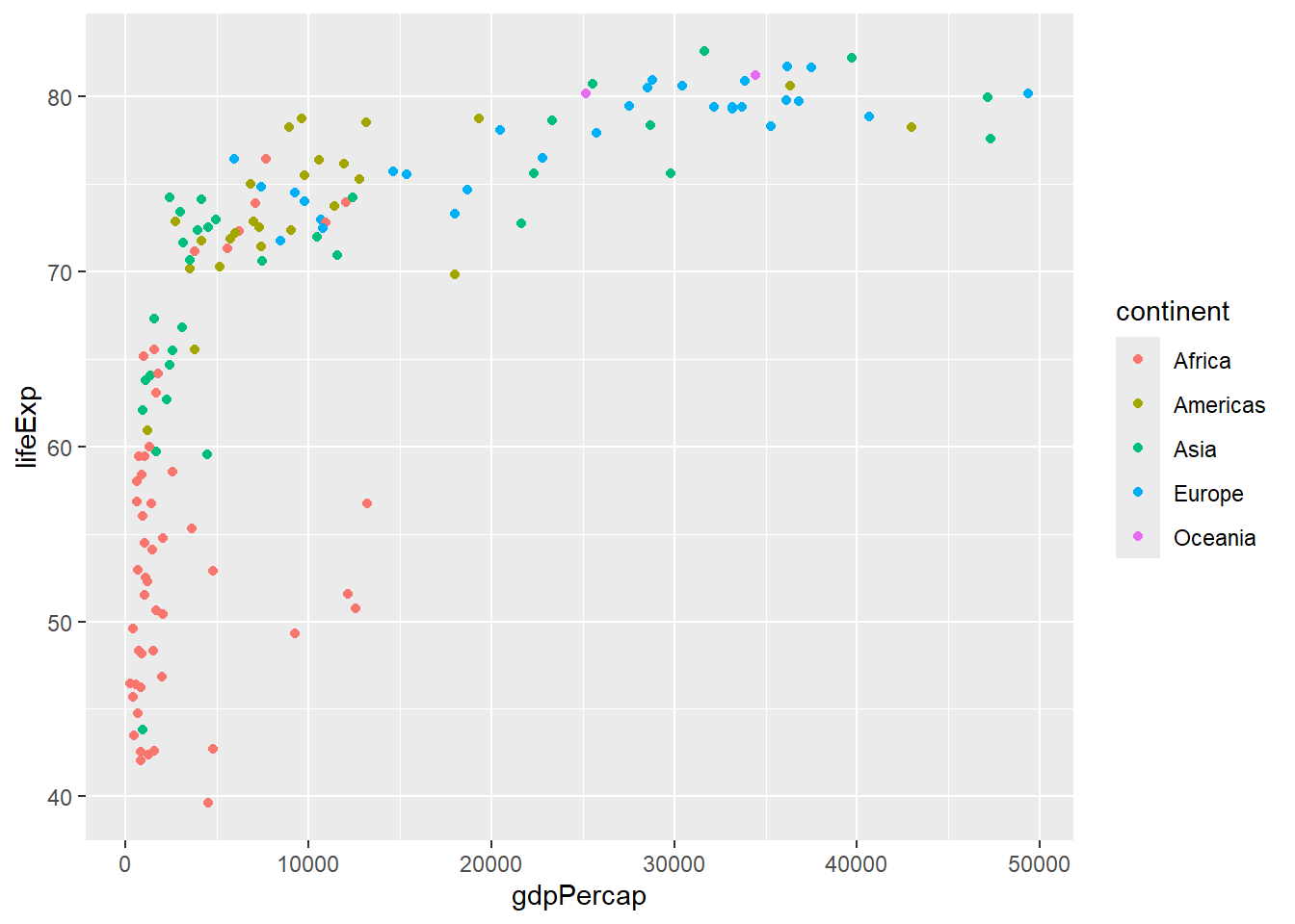 mapping = aes(x = gdpPercap, y = lifeExp, color = continent)) +