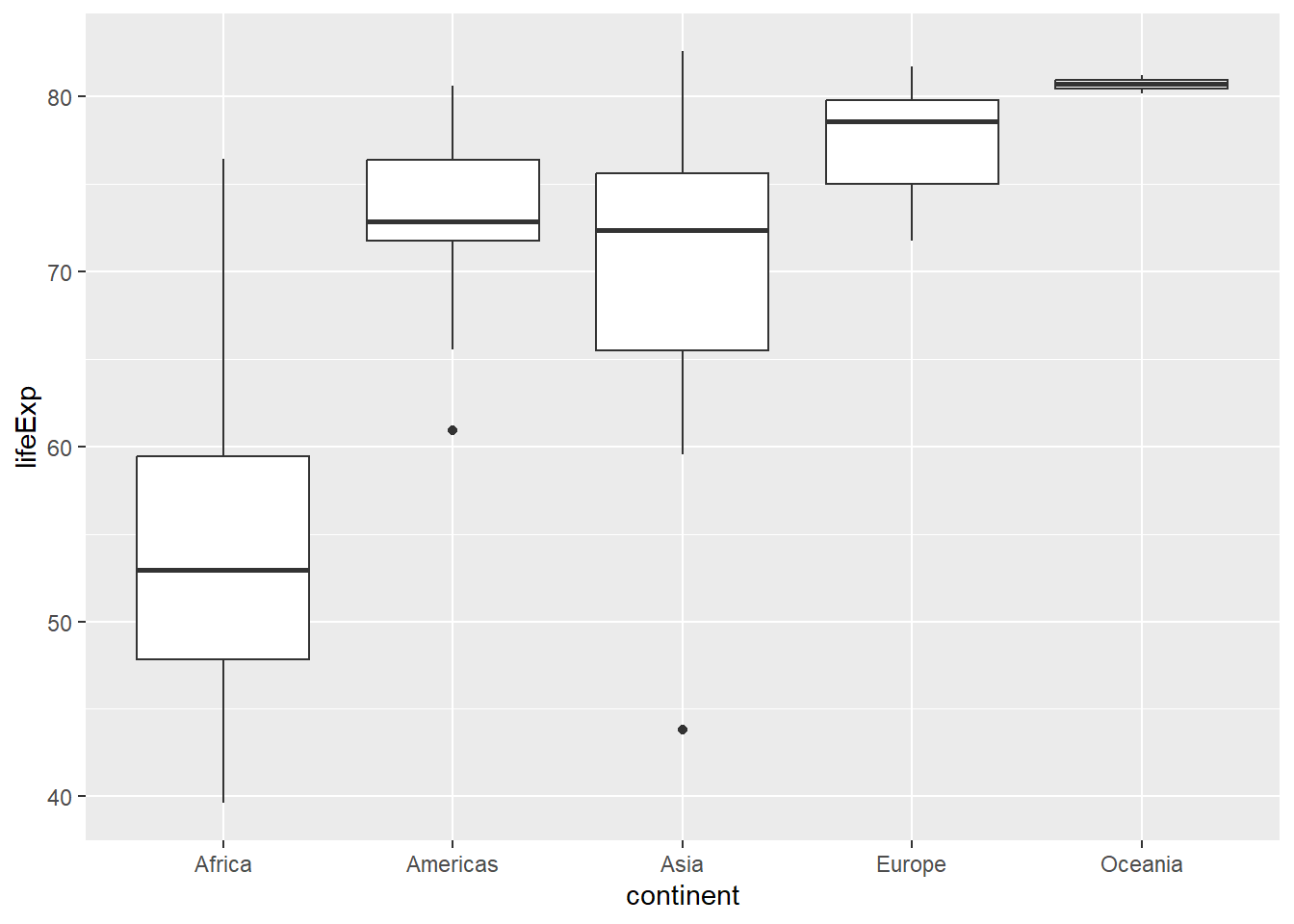 ggplot(data = gapminder_2007, aes(x = continent, y = lifeExp)) +