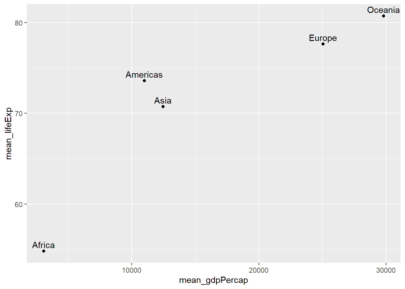 ggplot(aes(x = mean_gdpPercap, y = mean_lifeExp, label = continent)) +