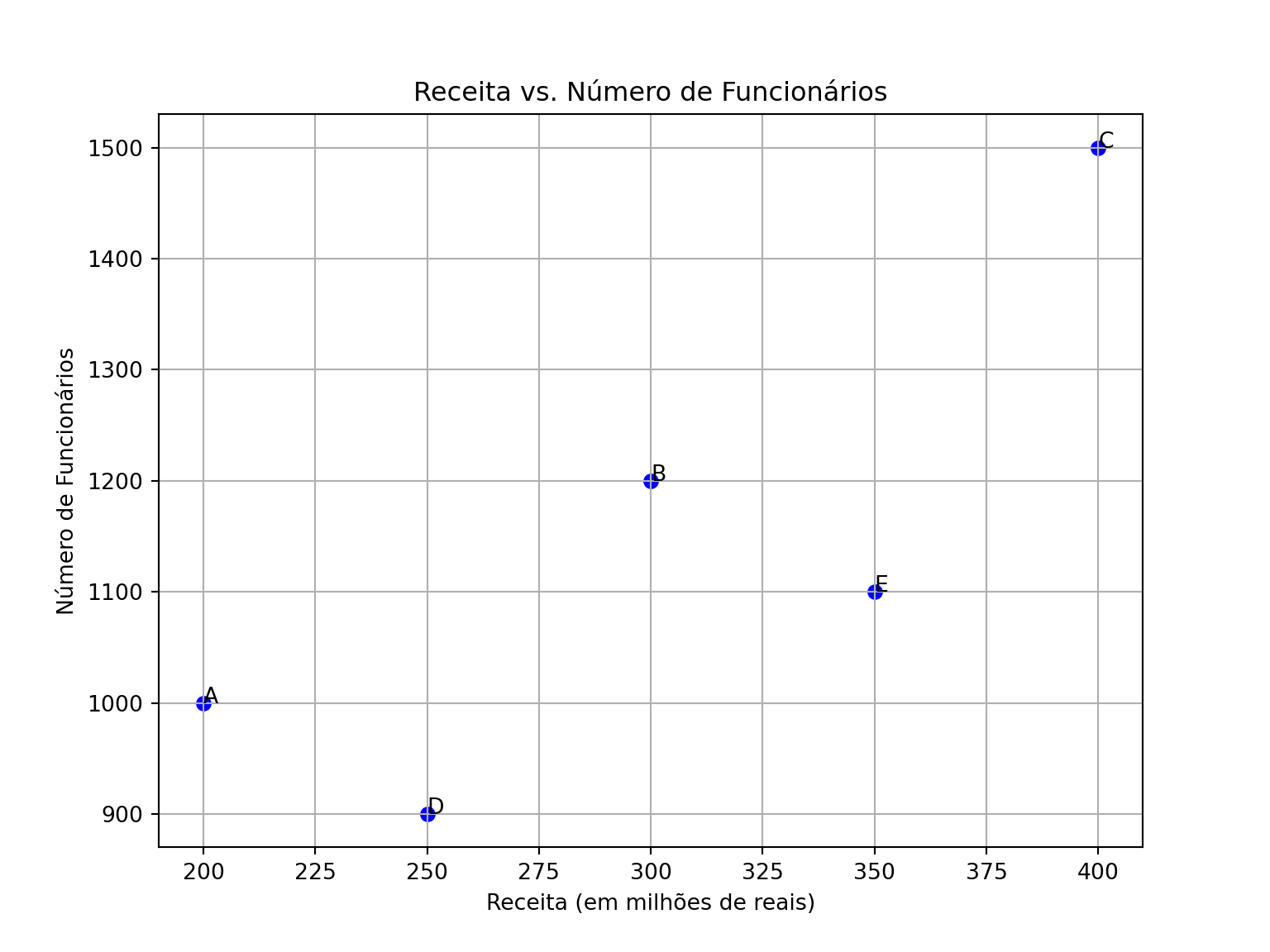 Neste exemplo, cada ponto no gráfico representa uma empresa, onde o eixo x representa a receita (em milhões de reais) e o eixo y representa o número de funcionários. As anotações são usadas para identificar cada empresa no gráfico.