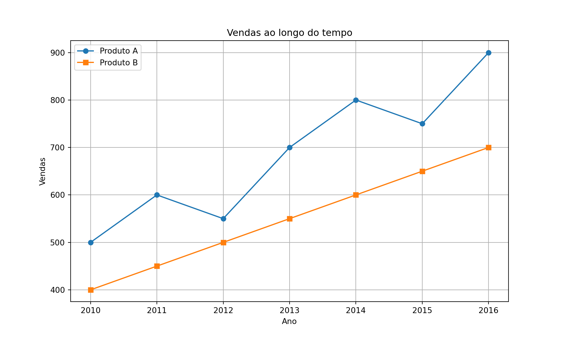 Na sequência, utilizamos o Matplotlib para criar um gráfico de linha que representa a evolução das vendas de dois produtos ao longo de vários anos. Cada ponto no gráfico representa o número de vendas em um ano específico.